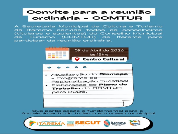 A secretaria municipal de cultura e turismo de itarema convida todos os conselheiros (TITULARES E SUPLENTES) do Conselho Municipal de Turismo (COMT [...]