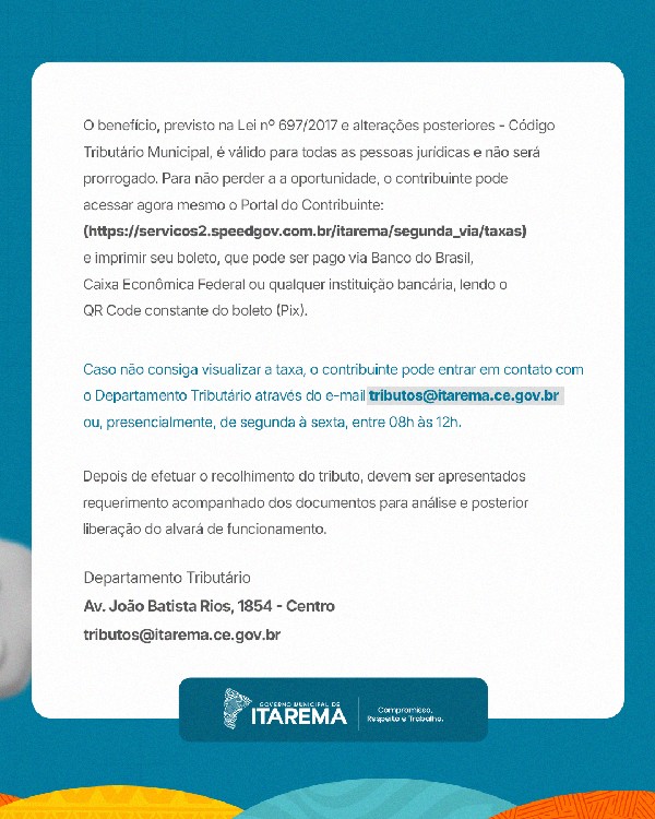 - Av. João Batista Rios, 1854 - Centrotributos@itarema.ce.gov.br